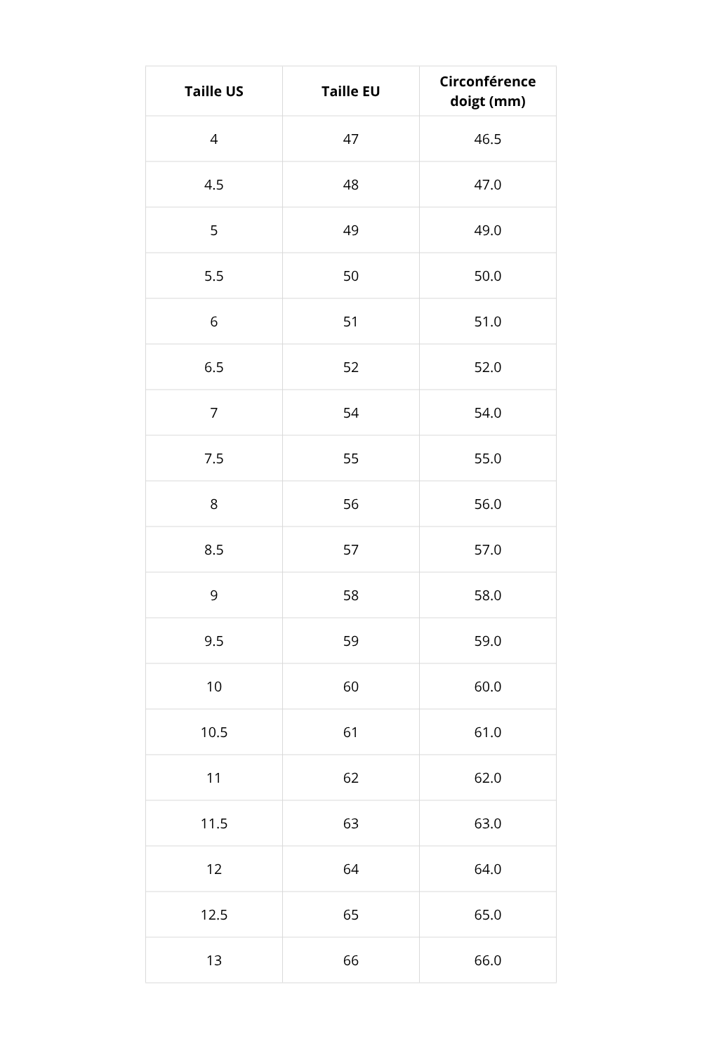| Taille US | Taille EU | Circonférence doigt (mm) |